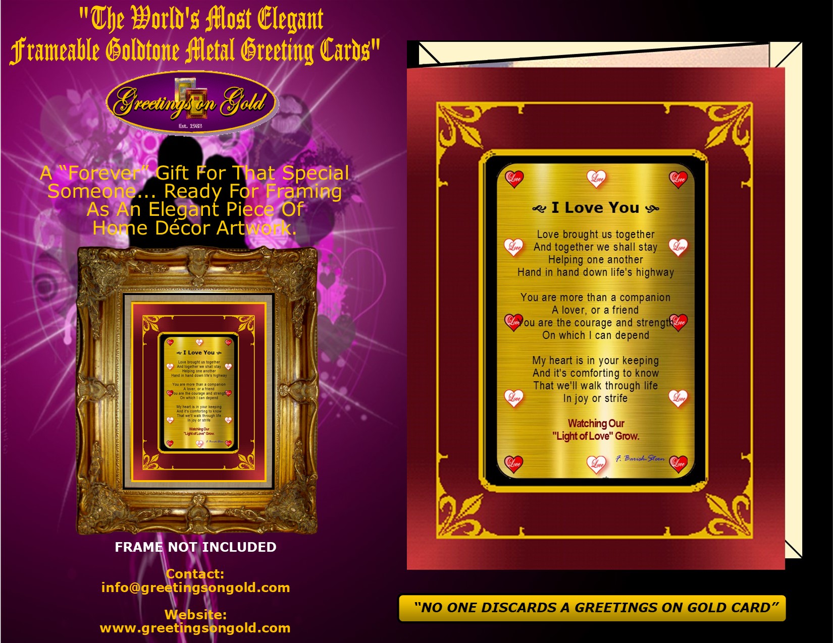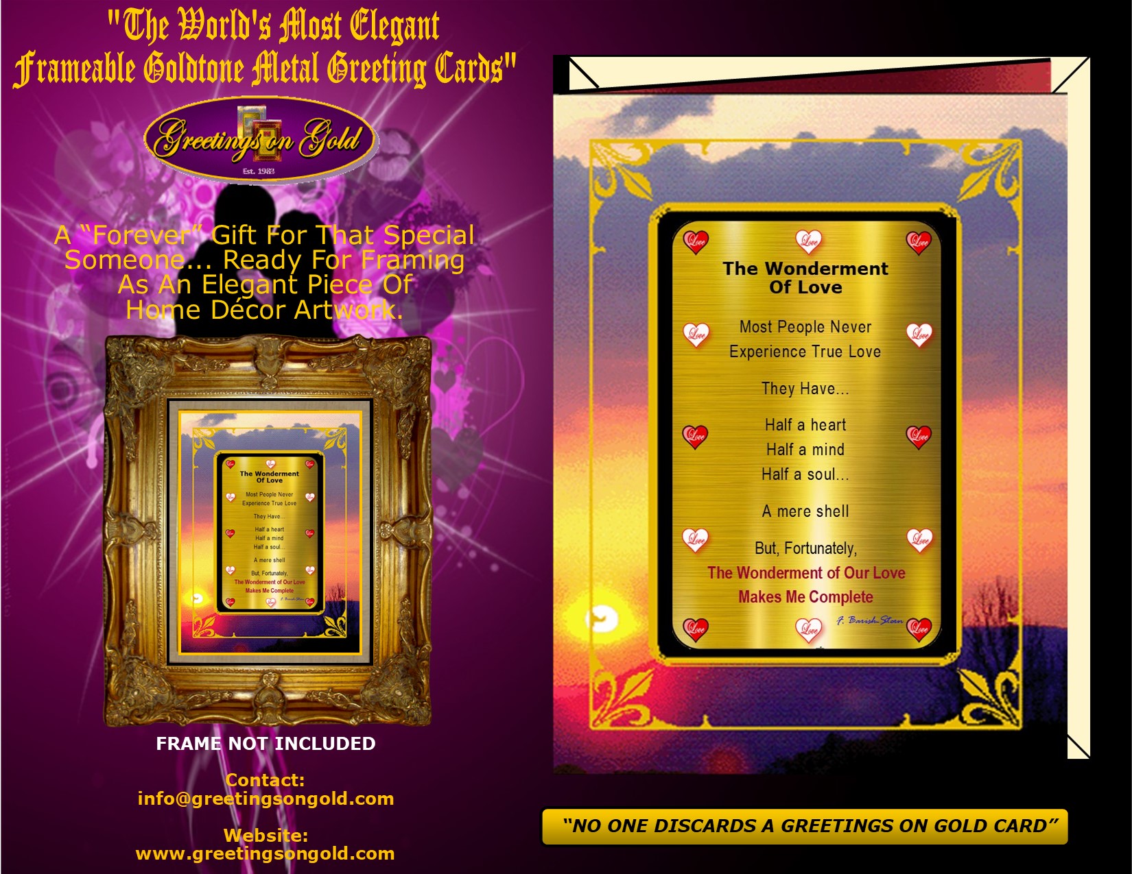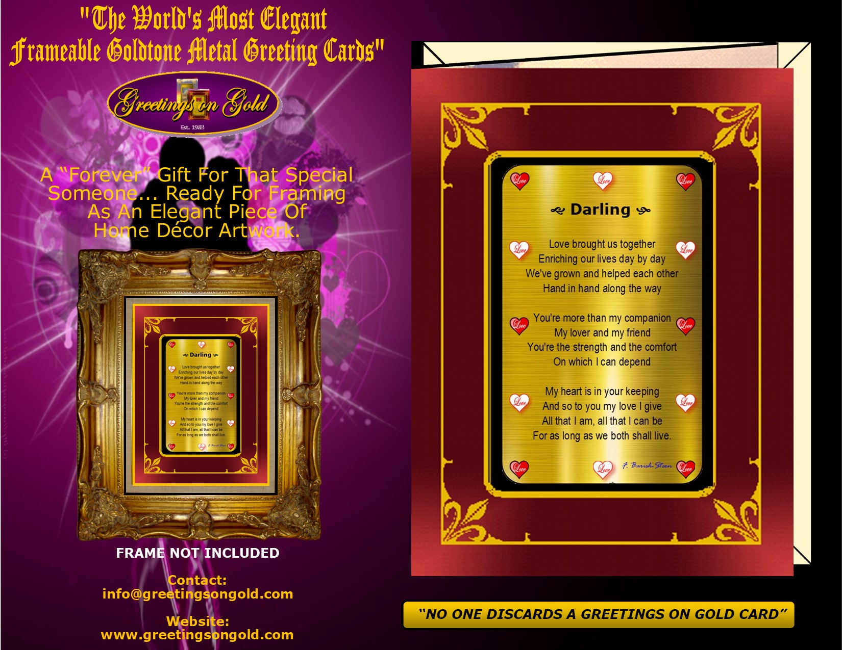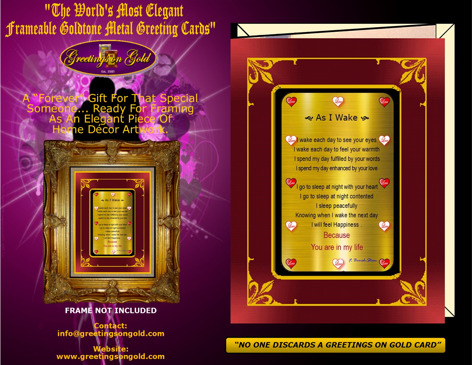 your personal salutation. F. Barish-Stern's award winning poetry and photographs are used exclusively for Greetings on Gold's revolutionary line of Frameable Metal Greeting Cards. All greeting cards ship within three business days of order date! Custom orders ship within 7 days. Each Greetings on Gold card includes a recyclable envelope for mailing and gift giving.